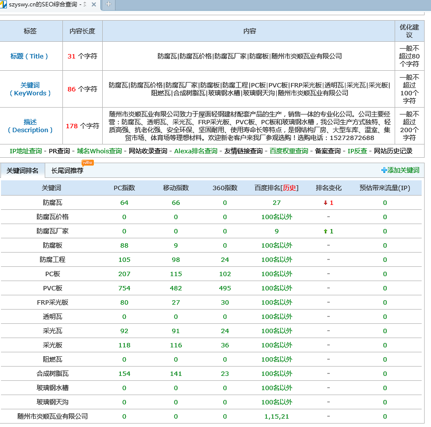小編在這隨州市炎順瓦業(yè)有限公司防腐瓦企業(yè)從事網(wǎng)絡(luò)運(yùn)營(yíng)已經(jīng)超過(guò)一個(gè)月了,從開始什么都不懂,到現(xiàn)在什么都懂了。今天一早,我用站長(zhǎng)工具查詢http://szyswy.cn網(wǎng)站關(guān)鍵詞防腐瓦廠家的排名,驚奇的發(fā)現(xiàn),哇!防腐瓦廠家關(guān)鍵詞排名竟然提升到第九位了,防腐瓦關(guān)鍵詞排名26名了。這一個(gè)多月,小編每天更新網(wǎng)站的內(nèi)容不斷發(fā)帖子,小編的不懈努力之下,排名終于有了起色。從之前的100名以外上升到第9名,萬(wàn)萬(wàn)沒(méi)想到百度權(quán)重從0升到1,這讓小編感到只有付出努力才能有收獲。其實(shí),小編覺(jué)得,網(wǎng)站不是每天更新的內(nèi)容越多,網(wǎng)站排名就越好的。網(wǎng)站排名怎么樣才能靠前,首先,更新的內(nèi)容要高質(zhì)量,能吸引訪客來(lái)閱讀,最好是原創(chuàng)真實(shí)有意義的文章,多發(fā)帖子,每天更新東西要新穎,看百度收不收錄,收錄多的話排名就越容易靠前。對(duì)于網(wǎng)絡(luò)運(yùn)營(yíng),小編不是很懂,但是小編知道,每天用心寫東西,不用百度推廣照樣靠前排名,一樣能讓企業(yè)網(wǎng)站搜索關(guān)鍵詞靠前,網(wǎng)站優(yōu)化是個(gè)漫長(zhǎng)工作,想要弄清楚摸透,必須鉆研學(xué)習(xí)SEO,所以,從最基本的優(yōu)化網(wǎng)站開始,一點(diǎn)一滴積累經(jīng)驗(yàn)是很關(guān)鍵的。作為網(wǎng)絡(luò)專員,看見(jiàn)企業(yè)的網(wǎng)站排名靠前,還是很欣慰的,每天優(yōu)化網(wǎng)站讓小編覺(jué)得是件有意義的事情,而不是單單的因?yàn)槭枪ぷ鞫プ。本網(wǎng)站文章為隨州市炎順瓦業(yè)有限公司版權(quán)所有,未經(jīng)同意,不得轉(zhuǎn)載,否則追究其法律責(zé)任的哦!隨州市炎順瓦業(yè)有限公司專業(yè)生frp采光瓦,FRP防腐瓦,frp阻燃瓦,frp平板,PVC防腐瓦,PC瓦,玻璃鋼水槽等等屋面建材,歡迎新老客戶前來(lái)選購(gòu)。